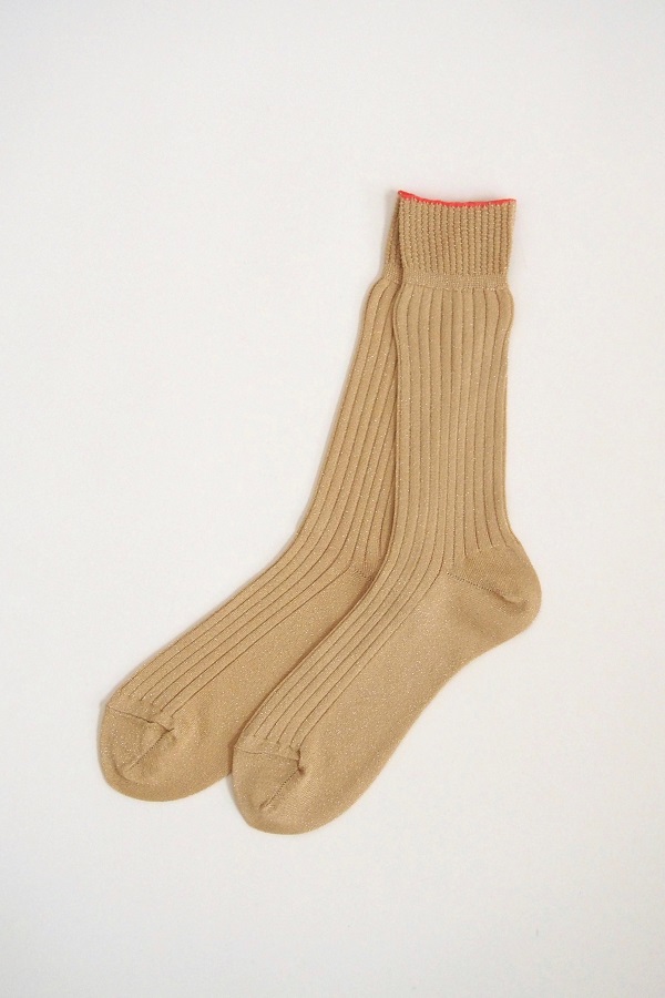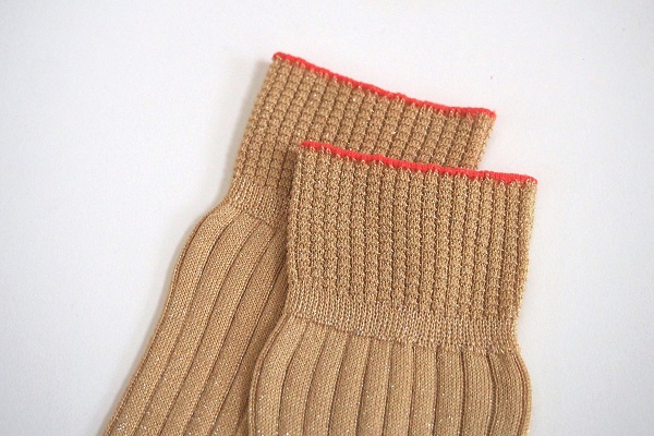 やわらかいゴールドのラメ糸をベースに、ゴム口には鮮やかなオレンジのワンラインをあしらった<ゴールド>。