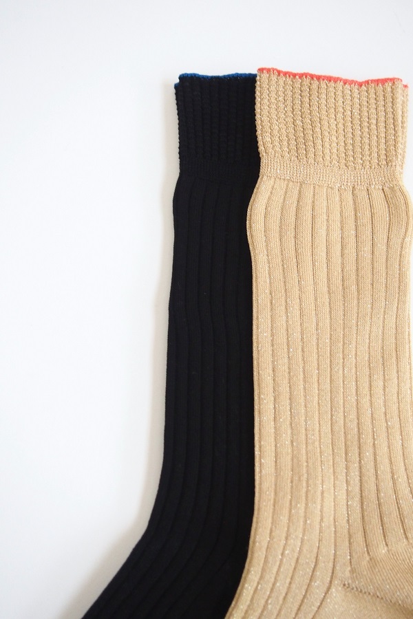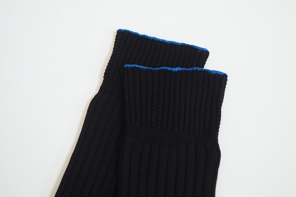 シャープなブラックのシルケットコットンをベースに、つまさきとかかとにはシルバーグレーのラメ糸、ゴム口には鮮やかなブルーのワンラインをあしらった<ブラック>。